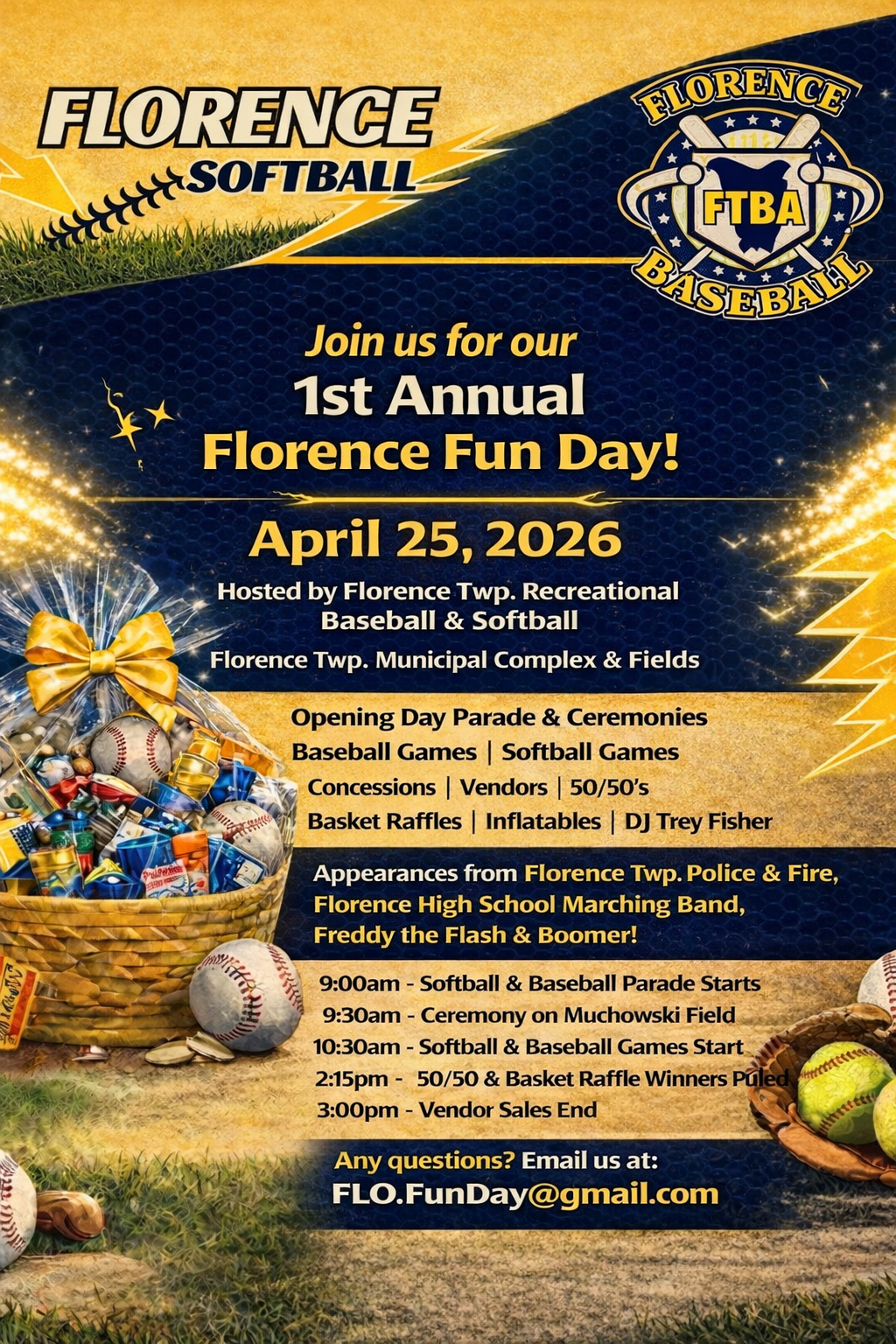 Mark your calendar for April 25th and head to the Florence Municipal Complex for an exciting celebration of opening day! Cheer on our local Baseball and Softball teams as the season kicks off. Whether you're a die-hard fan or just looking for a fun community event, this is the perfect way to show your support and soak in the spring sports spirit.