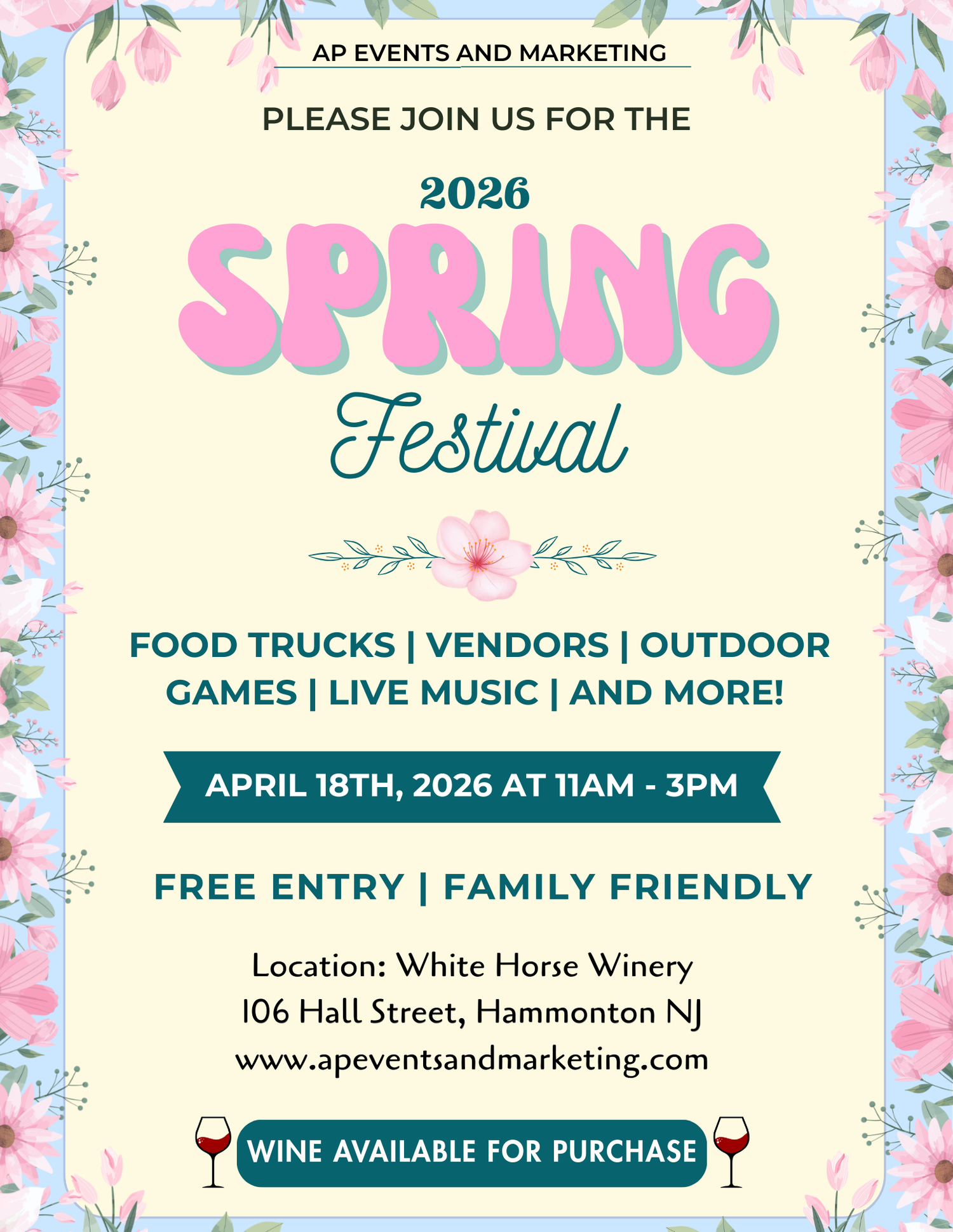 Mark your calendar for something special! Join us Saturday, April 18th from 11AM–3PM at White Horse Winery for our 2026 Spring Festival. Located at 106 Hall Street in Hammonton, NJ, this FREE family-friendly celebration is the perfect way to welcome the season. Bring the whole crew and enjoy a beautiful spring afternoon with us.